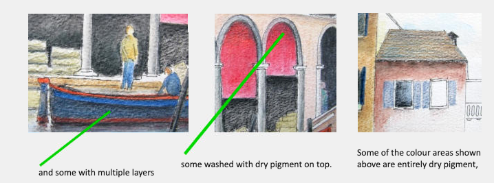 Cold pressed paper has a grain on the surface which gives high points to engage with the pencil or brush point, and valleys which can leave white flecks typical of a watercolour style. If we work dry pencil pigment along the paper surface we can leave a pattern of colour and white paper which differs according to the paper manufacturer's design.
