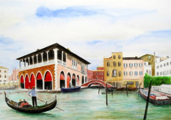 Venice Rialto Fish Market worked in Staedtler Karat Aquarelles on Clairfontaine Etival 300gsm cold pressed watercolour paper.