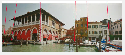 Look at the photo image above. Look at the red guidelines that I have drawn over it on screen and see how the width of view and combination of photos has given us some major distortions of lines that should be vertical.