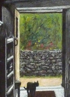After the spray with fixative, the picture looks like this (left). You can see how the pastel has been ‘washed’ into the paper, and the brown colour of the mat and the stone wall outside has disappeared. The next layers of pastel pencil will bring this back and we will fix, again, leaving a better result.