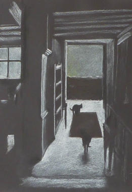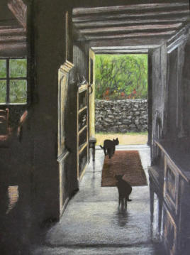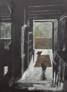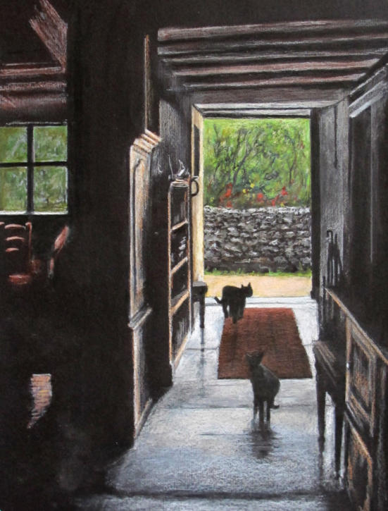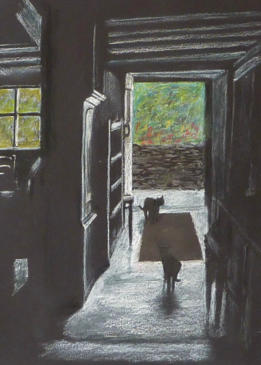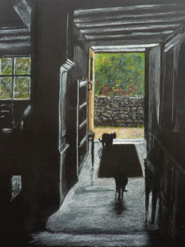 Lake Distict Cottage Entrance by Peter WeatherillThe image above shows the drawing on black paper virtually completed.