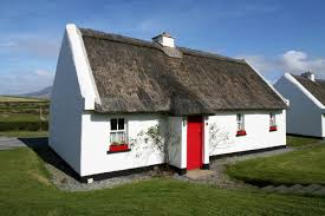 Thatch is laid in layers and the top layer is laid to shed rain, with a top line along the crown of the roof often laid in a pattern. Thatched cottages often have chimneys separated from the roof to keep the risk of fire down. Irish and Scottish thatch is often seen with solid end walls as shown below.