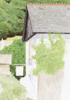From the image above, you will see the small tree area at the left side of the house has been completed with scribble strokes in a selection of greens, being careful to outline the house wall with a straight edge using mid green, and you will also see that I have left a clear area for the bar which the sign is hung from. It is dark in the reference, but I think it will look better white. I have added a final burnish of a yellow green on top of those trees to keep them lighter than the bank of trees behind.