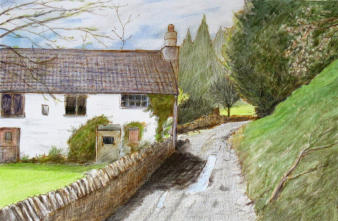 Peter worked the Welsh cottage scene on Fabriano Hot Pressed paper (300gsm) using Waterman Brown ink. The pencils used were Derwent Coloursoft and Procolour. There are five layers of different greens on the sunlit grass.