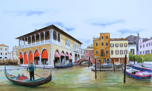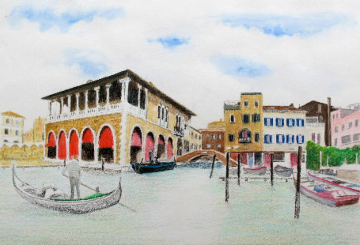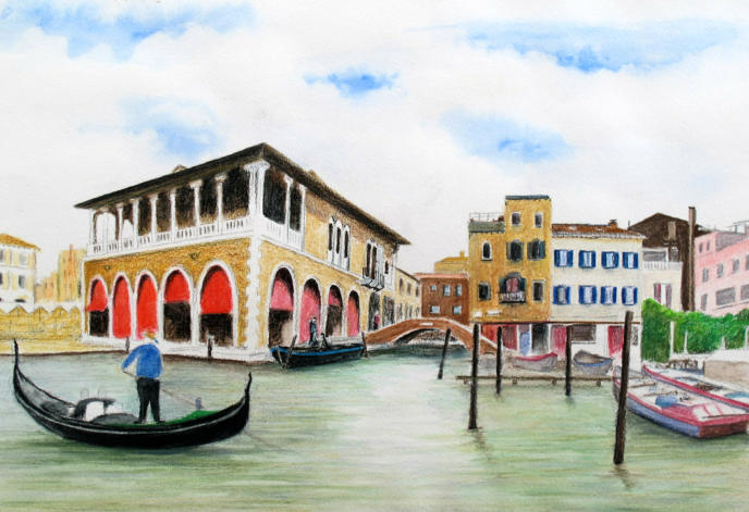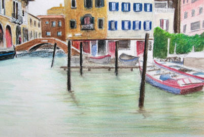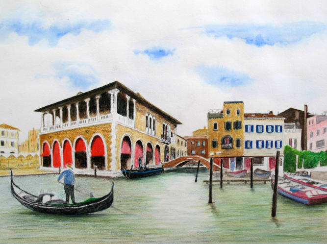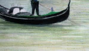 Above is a close-up of the water with the first layer of dry colour applied. And here's the overall view of the picture with the foundation of the Gondola in place. It's a work in progress, but I'm excited to see where it takes me.