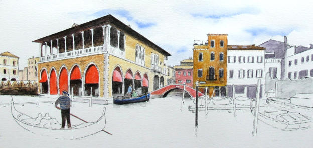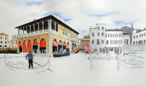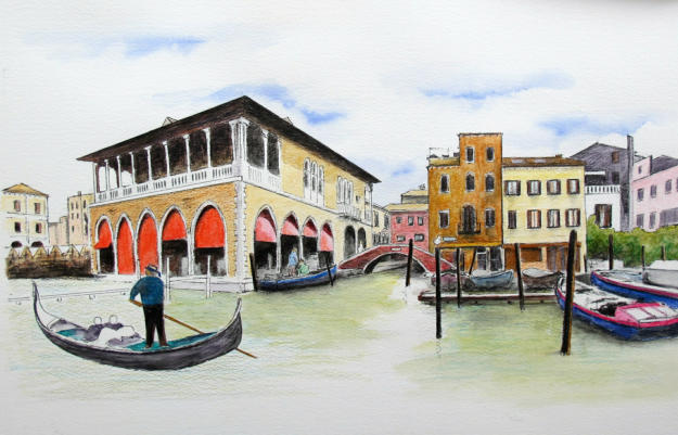 I grab some pencils and add the final touches, focusing on detailing the Gondola and Gondolier, as well as the boats on the right-hand side.
