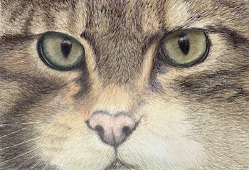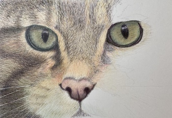 This technique prevents graphite from smudging the whiskers. When applying coloured pencil pigment, it will neatly skip over the indented areas, leaving the whiskers a clean white.