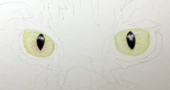 Next, use light pressure to draw black radiating lines in the iris, then burnish them with Pale Sage (P) using firm pressure. This will add depth and dimension to the eye.