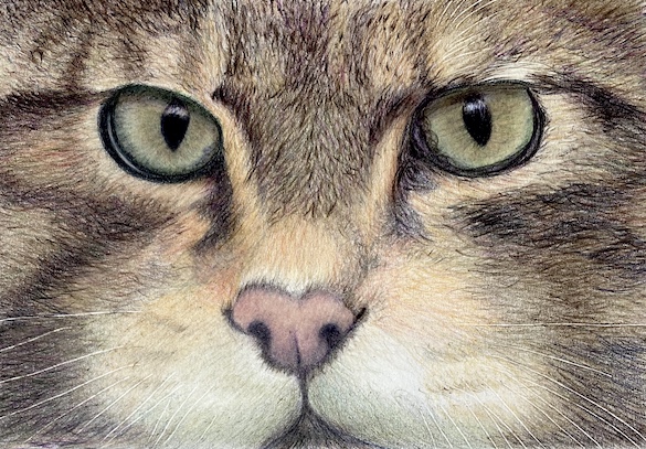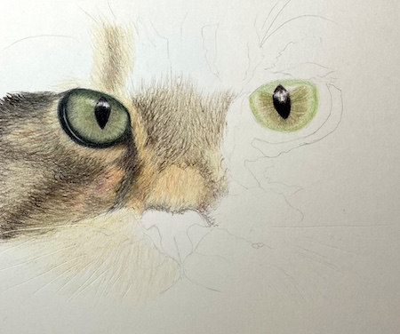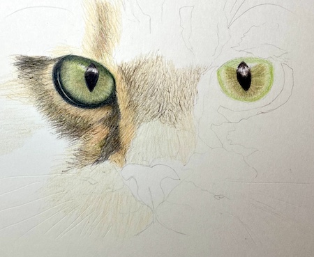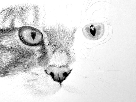 I refine the fur texture and values around the eye on the right, carefully following the direction of the fur to capture the cat's likeness.