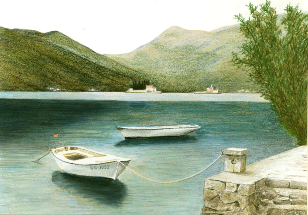 Derwent Artist pencils in the colours shown, on Strathmore Colored Pencil paper. A single layer of each colour was used with firm pressure.While not strictly an underpainting, burnishing is relevant here.