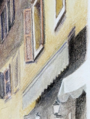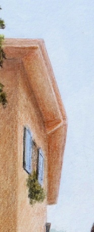 Notice how the fine-pointed Pablo coloured pencils allow for crisp detail in the shadow areas, defining the shutters and windows on the upper level.