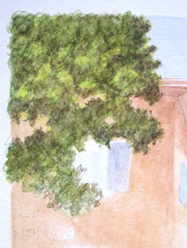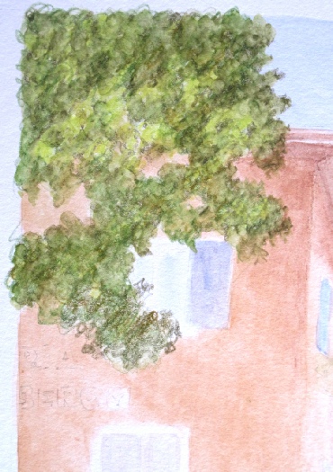 The only remaining wet process is developing the tree foliage, balcony, and window boxes. These areas of green leaves and flowers are best tackled with dry Aquarelle pencil and a damp brush – a technique we'll explore next.