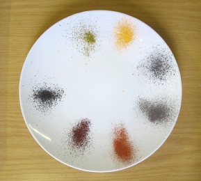 There is an Olive Green, a yellow orange (an ochre would do), a blue, a medium cold grey, Venetian red, a purplish red, and Paynes Grey on the plate. The additional colours provide some further hues to get the full range.
