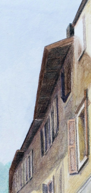 I've begun working on the roof line and upper windows using dry pencil. My tool of choice is the Caran d'Ache Supracolor, but any wax-based pencil will do for these later stages, as water is no longer involved.